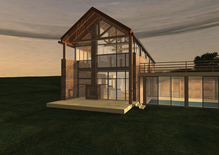 KSZTAŁT DOMU Siedlisko swoim układem i architekturą nawiązuje do tradycyjnej formy zabudowań mazurskich. Elementem organizującym przestrzeń jest wewnętrzny dziedziniec z drzewem, do którego prowadzi wijąca się po terenie droga. Dwa domy usytuowane są po przeciwległych stronach dziedzińca - połączone są basenem oraz znajdującym się ponad nim wspólnym tarasem. W tylnej części podwórza znajduje się garaż ukryty w skarpie. Naturalne ukształtowanie terenu ma odbicie także w różnicy poziomów pomiędzy poszczególnymi budynkami. Proste i podłużne bryły domów, przykryte są dachami dwuspadowymi, charakterystycznymi dla mazurskich osad, opartymi na drewnianej konstrukcji wypełnionej cegłą. O nowoczesnym charakterze decydują duże przeszklenia w ścianach szczytowych i dość nieregularny układ okien na pozostałych elewacjach a także kubiczne formy dodane do centralnych części domów i wysunięte wiatrołapy.