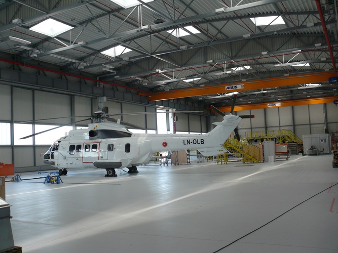 Hangar do wykonywania przeglądów i napraw śmigłowców, wraz z płytą postojową. Budynek na rzucie prostokątnym, złożony z jednokondygnacyjnej części hangarowej i przylegających do niej: zaplecza warsztatowo-magazynowego oraz dwukondygnacyjnej części biurowo-socjalnej.